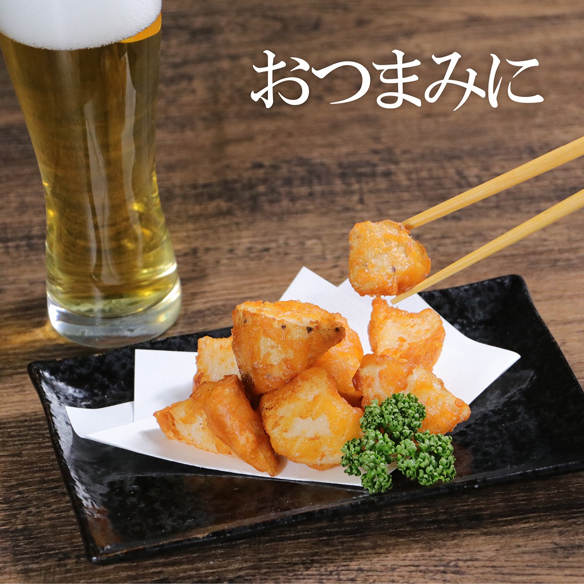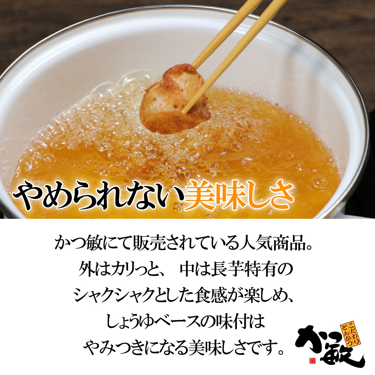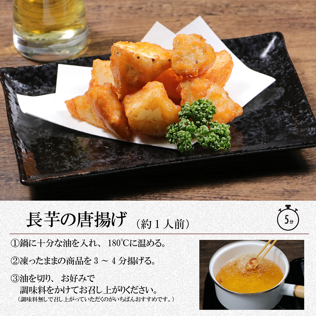 | 原材料 | 長芋、衣(小麦粉、でん粉、食塩、にんにく粉末、粉末醤油、ぶどう糖、砂糖、黒こしょう、オニオンパウダー、脱脂粉乳)/加工でん粉、調味料(アミノ酸等)、ベーキングパウダー、乳化剤、パプリカ色素、(一部に小麦・乳成分・大豆・やまいもを含む) |